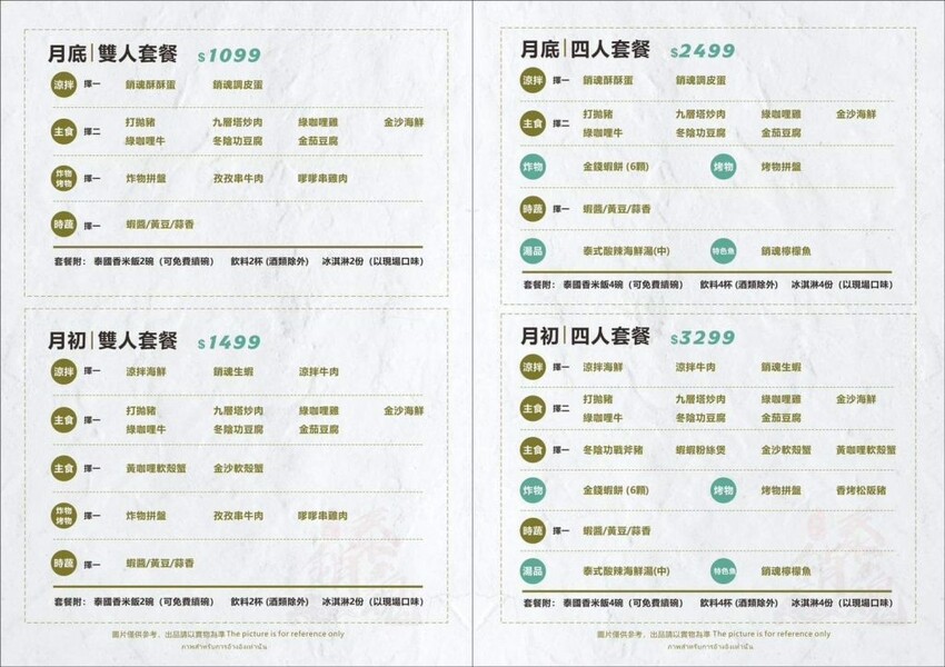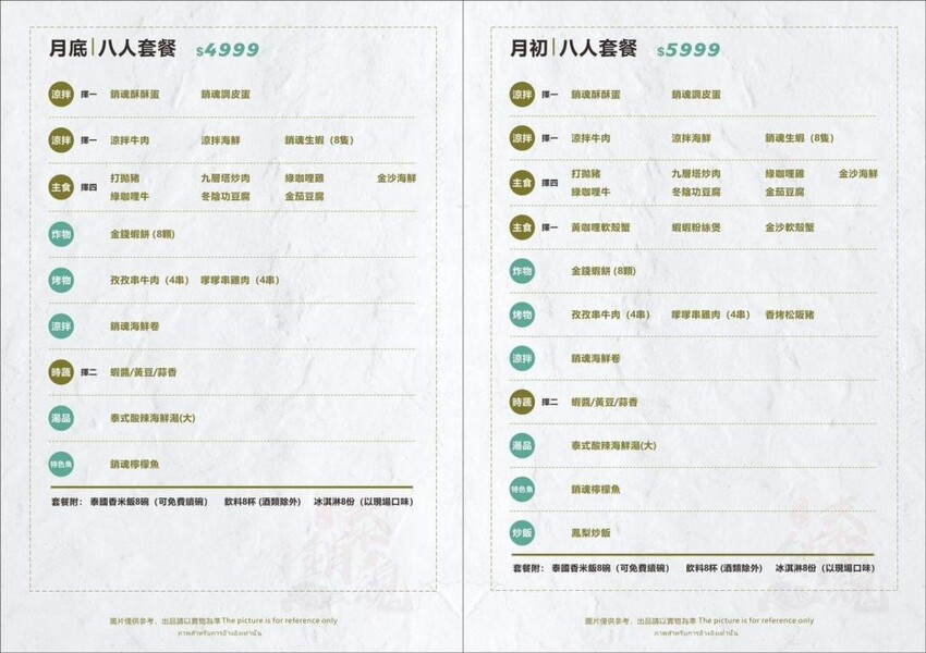 【泰銷魂泰式餐廳】以正宗的泰式菜系為主打,堅持承襲當地的鹹酸辣風味,不提供更改調整口味辣度,經典的打拋豬、綠咖哩、金錢蝦餅通通有,也有少見的泰北清邁傳統菜,基本上能想到的泰國菜通通有,還有適合多人的套餐,平日午間則有提供划算的個人套餐。