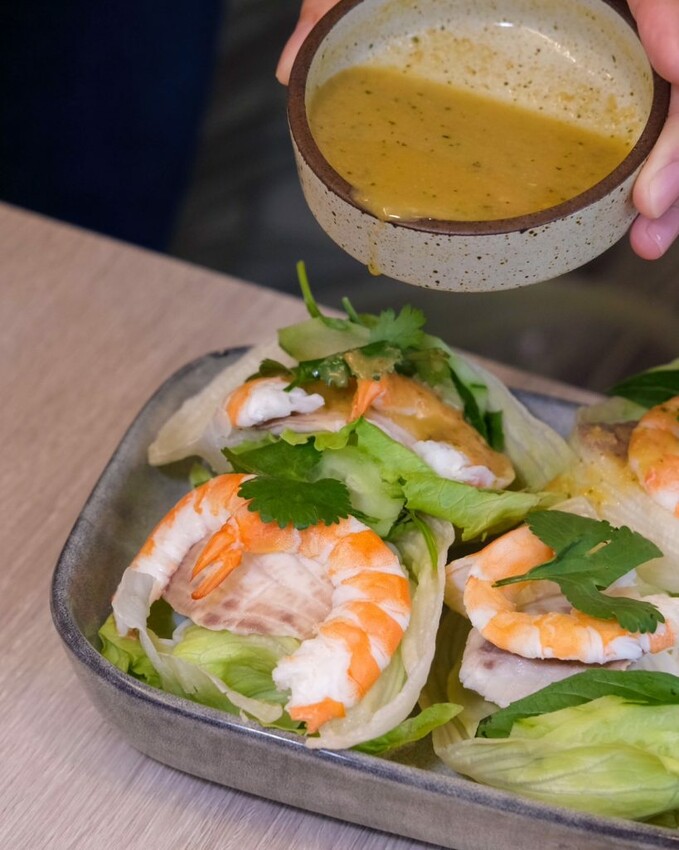 ▼店家獨創的特色菜銷魂海鮮卷,每份共有四卷,改編自當地的街邊美食泰國烤魚,將美生菜包入米線、魚片及蝦子,最後再淋上花生香氣的醬料,大口咬下充滿層次感,很推薦大家試看看!