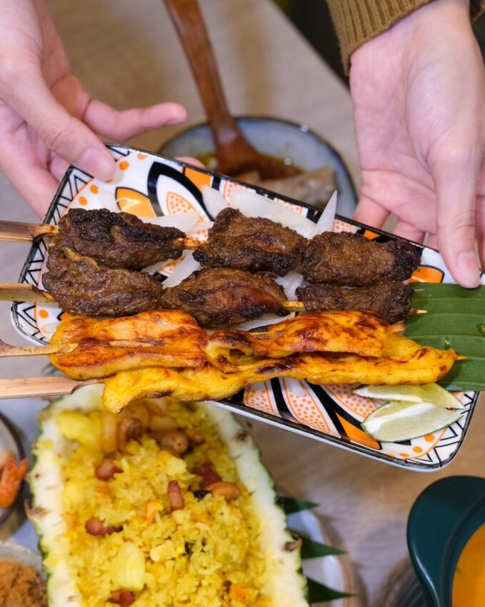 ▼烤物拼盤可一次吃到兩款烤串,使用美國安格斯牛肋條的孜孜串牛肉,吃起來帶有孜然的獨特香氣,以沙嗲先醃再火烤的嗲嗲串雞肉,充滿花生和椰奶的味道,沾上店家特製的「瓜瓜醬」超讚!