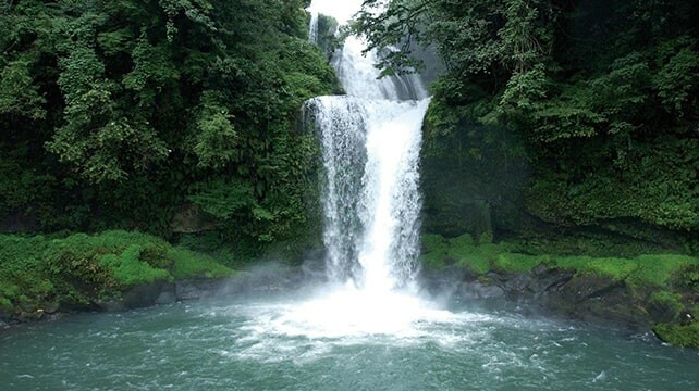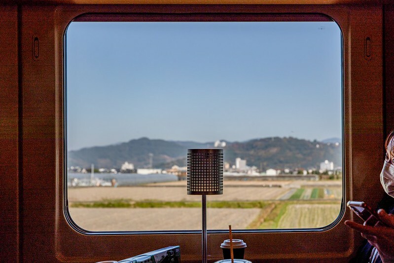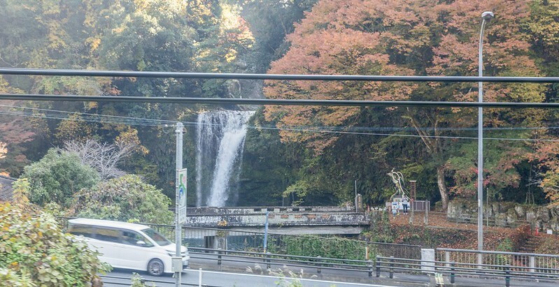 日本的觀光列車通常在行經附近著名景點時,會有廣播、牌子,提醒大家準備欣賞窗外一閃即逝的風景,甚至會放慢速度讓乘客有更多的時間拍照,比方這是大分日田市天瀬町與玖珠町的交界,上段長20m、下段長10m合起來約有30m落差的二段慈恩瀑布。