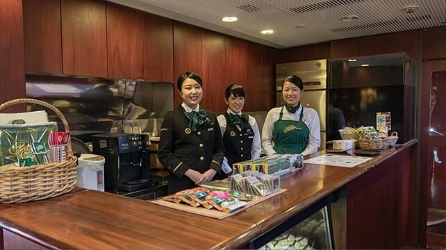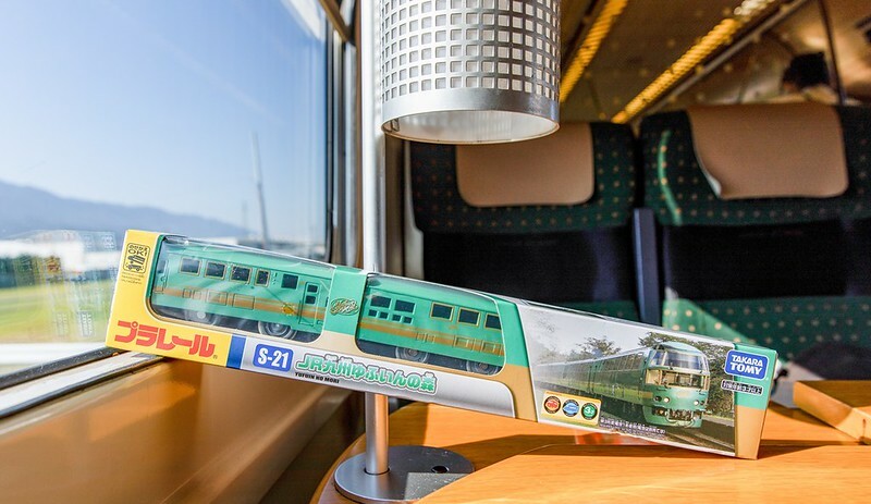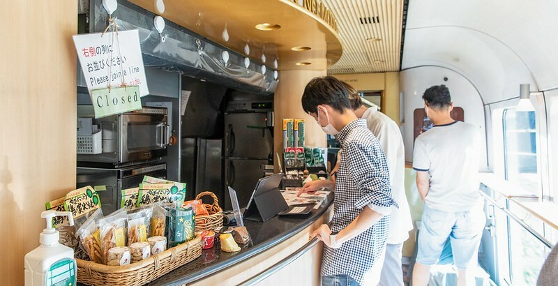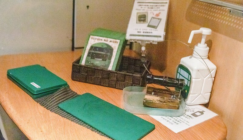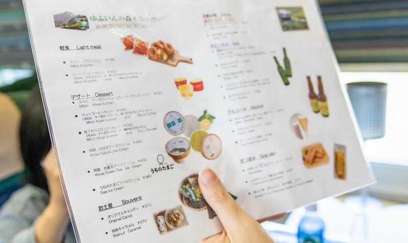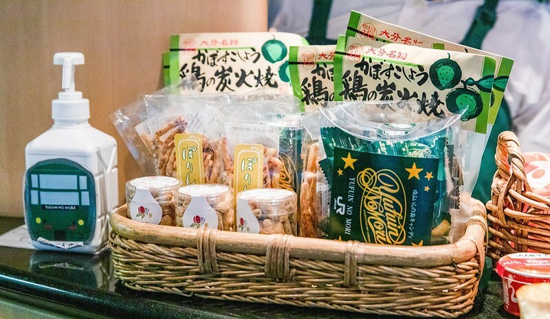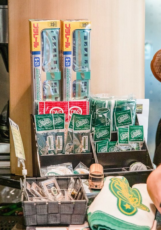 比較可惜的是我們搭乘的KIHA72沒有公共空間(面窗餐車),但也是有一個簡單的販賣部,賣著不少大分的物產和由布院之森限定的商品。