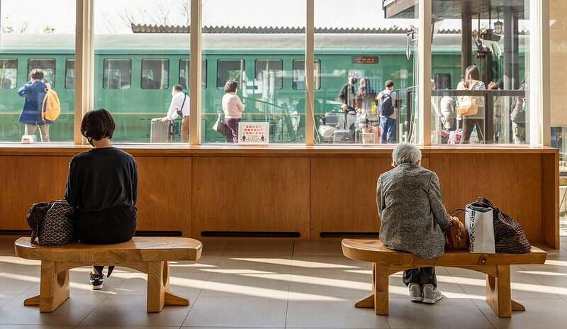遊客中心內有整排迎著陽光的落地窗景,可以用比較完整、輕鬆的角度看停靠在月台的由布院之森。