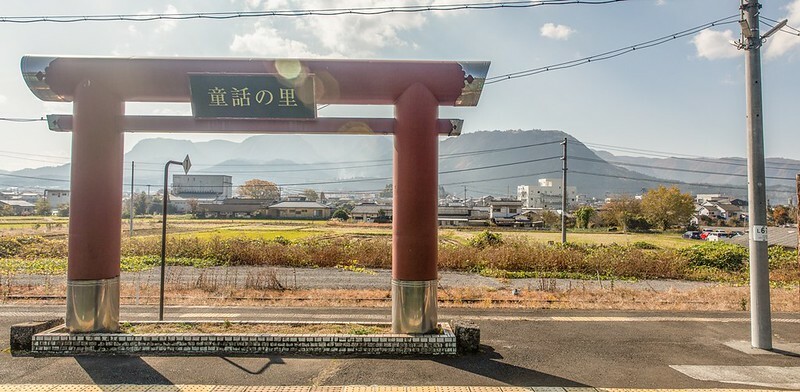 另外,這個豊後森駅的月台上居然有一個鳥居也太酷了吧,而鳥居的後面是平頂的雲霧平頂山同樣酷酷的山形。查了一下,這裡(玖珠)之所以是童話之里的說法,來自明治時期的文學作家「久留島武彥」,他曾在此創作了大量的童話故事,並有「日本安徒生」的美譽。更特別的是而久留島武彥是豐後森藩最後一任藩主久留島通靖之子。