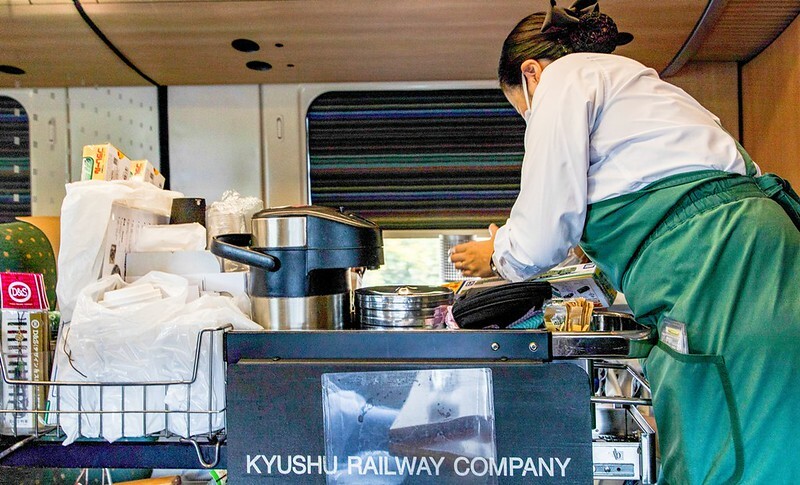 懶得移動的,也有類似咱們高鐵的椅邊服務....可以點的飲料、地酒、餐點、土產和紀念品,遠比我想像多很多很多。據說以前還有米其林一星北九州名店「竹本壽司」監修的原創列車便當。