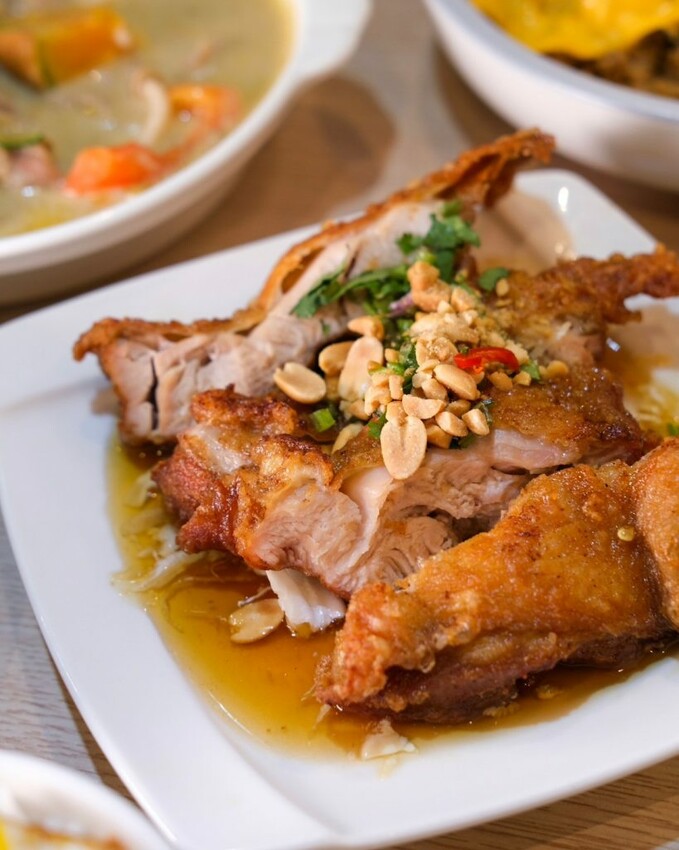 ▼擁有金黃色澤的椒麻雞腿,麵衣卡滋卡滋很是酥脆,肉質柔軟帶有厚度,迷人的椒麻香氣,伴隨著花生及香菜,讓人忍不住一口接一口。