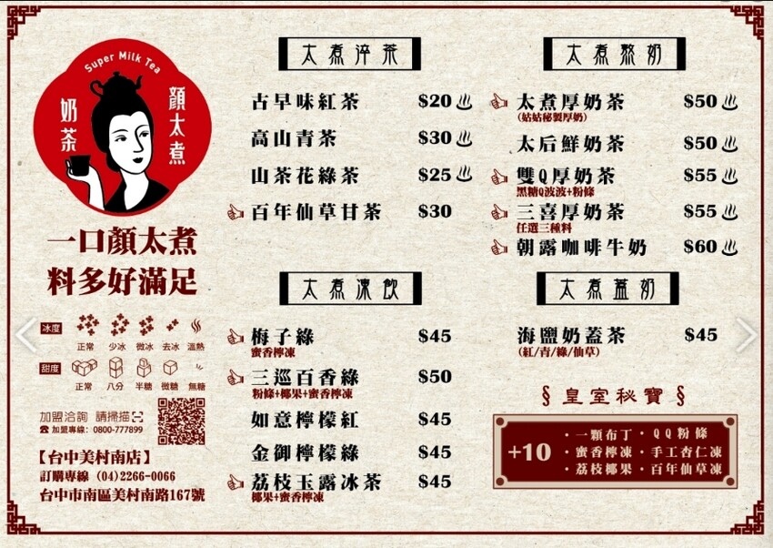 【顏太煮奶茶】主打厚鮮奶茶和爆料系手搖,包含純茶、厚奶茶、奶蓋茶和果香茶,七款配料每份10元,價位相當平易近人,最貴的也不超過60元。