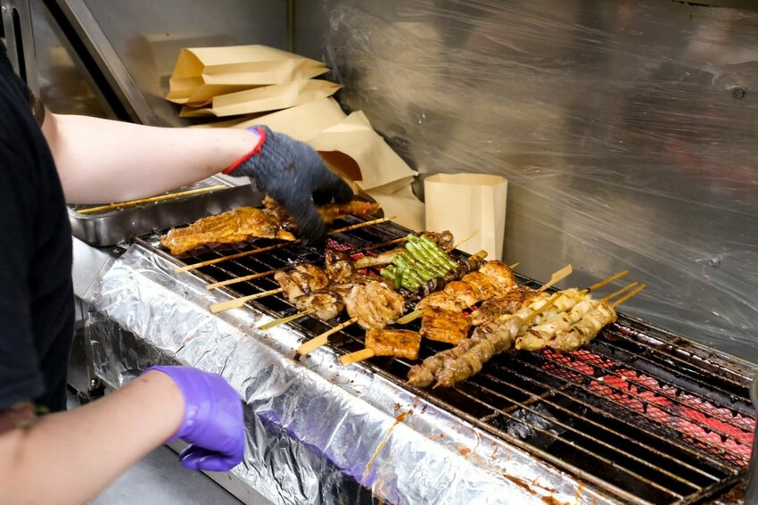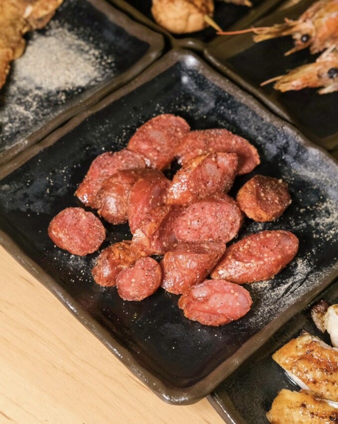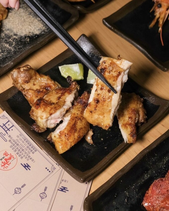▼【柒息地串燒居酒屋】的串燒都是先炸再烤,使用炭火燒烤多了一股香氣,搭配數十種配方調配而成的刷醬,調味微甜帶點焦糖香氣,最後再撒上秘製的椒鹽粉就完成。