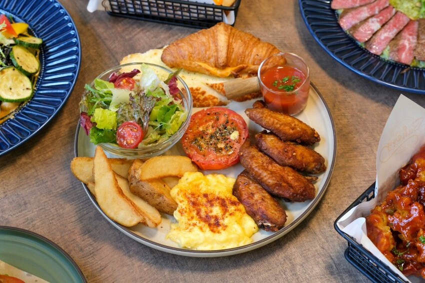 ▼早午餐拼盤的墨城辣醬炸雞翅,可以任選一杯45元的飲品,包含生菜、帶皮薯塊、烤香料番茄、英式炒蛋等配料,麵包更有可頌和軟法兩款類型,附上墨西哥辣醬可以自由調味,很喜歡這個英式炒蛋,有奶油香跟牛奶的滑嫩感,吃完整份讓人好有飽足感!