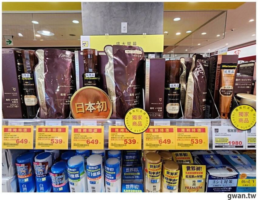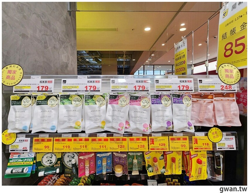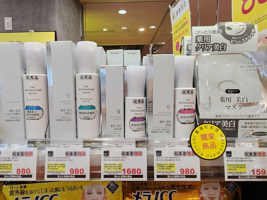 松本清的保養品選擇也超級多,還有很受到大家推崇的自有品牌系列!只要看架上有貼松本清獨家商品,或是標牌左上角有黑色框框寫matsukiyo就是自有品牌。以唇部保養來說,像ARGELAN的潤唇膏、THE RETINOTIME的潤唇精華都是熱賣商品
