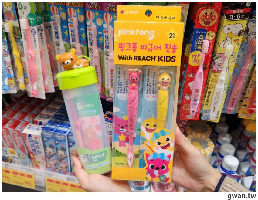 一整片的牙刷,大人小孩都有,看得我都眼花撩亂了