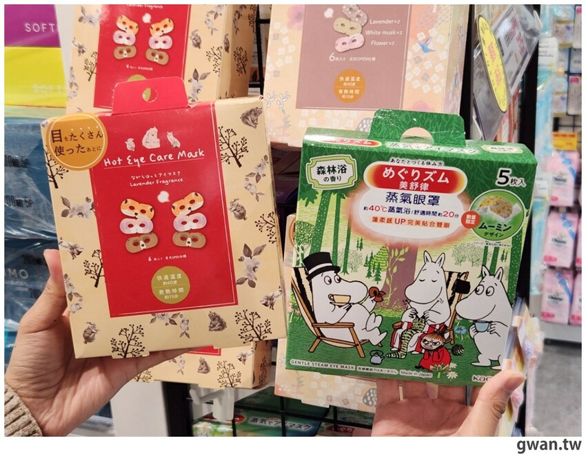 大家每次去日本都很喜歡買的蒸氣眼罩,這裡有嚕嚕米聯名款,還有動物造型的(狐狸、兔子、熊)好可愛喔