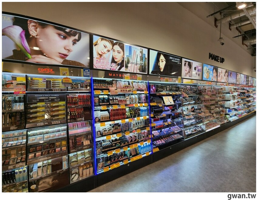 店內也有一整排的開架彩妝,日、韓、歐、美彩妝都很齊全,除了一般常見的MAYBELLINE、KATE、CANMAKE、1028…等等,還有較少見的日系彩妝excel