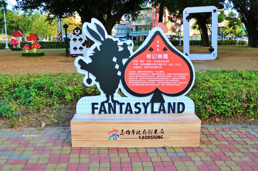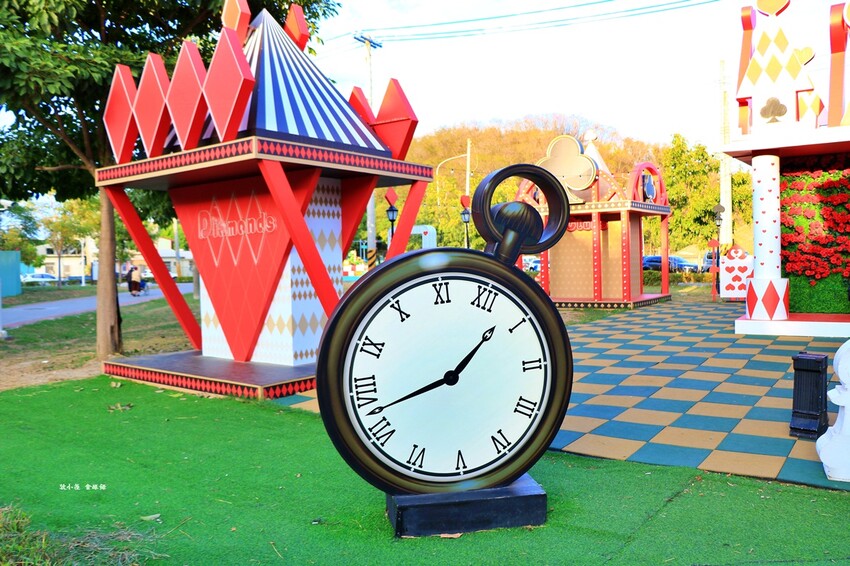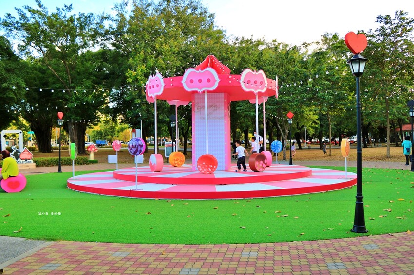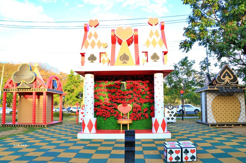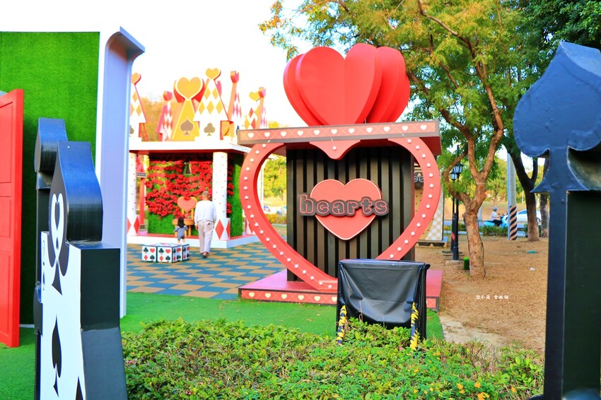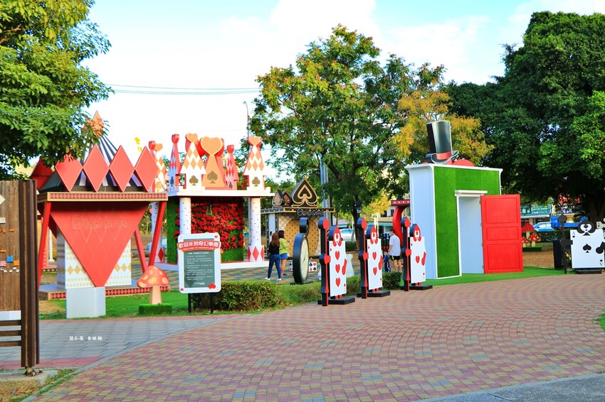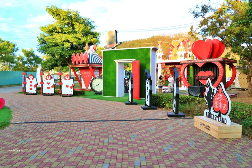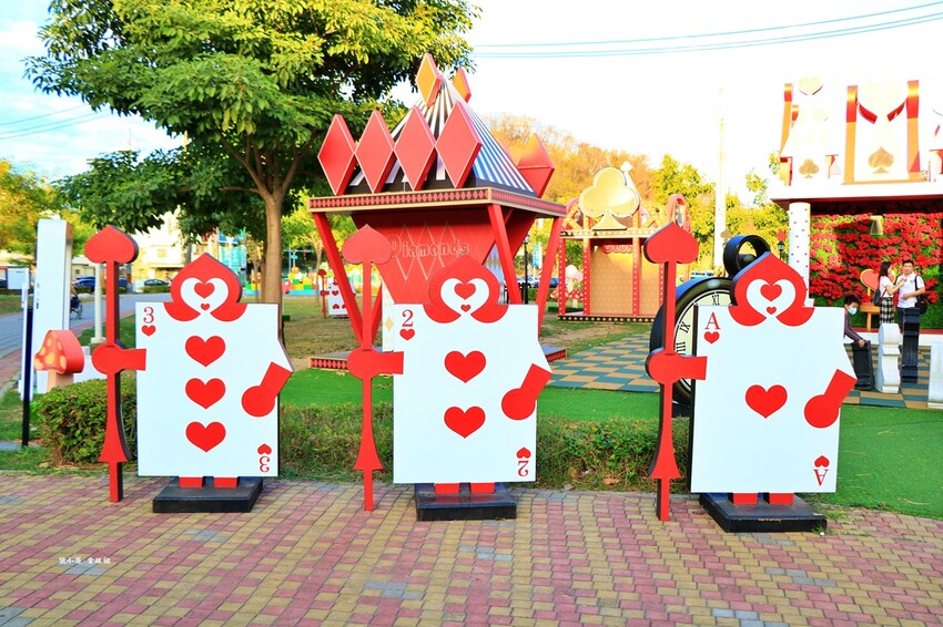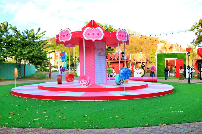 奇幻樂園宛如愛麗絲夢遊仙境,有棒棒糖旋轉木馬車、紅心騎士、黑桃士衛,晚上有燈光拍起來更美