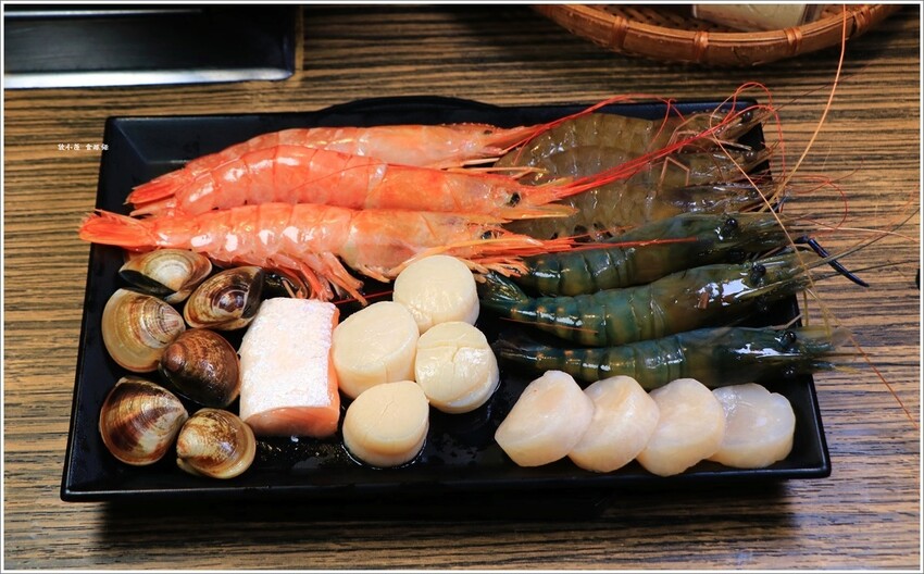 蛤蜊、天使紅鑽蝦、挪威鮭魚肚、生食級干貝、海味雪干貝、泰國蝦、海味大白蝦