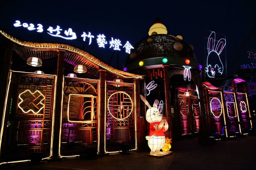 2023竹山竹藝燈會入口處就是大型燈飾-竹光閃耀,就連不同圖案的花框都是竹子編織而成,相當厲害啊! 而且今年結合兔子更是可愛,讓不少民眾拍不停~