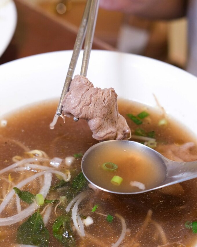 ▼牛肉湯的湯底跟牛肉河粉湯是一樣,建議可以先喝一口清湯,再放入九層塔和擠點檸檬,每一口的味道都有不同層次,牛肉則是比較有嚼勁的類型。