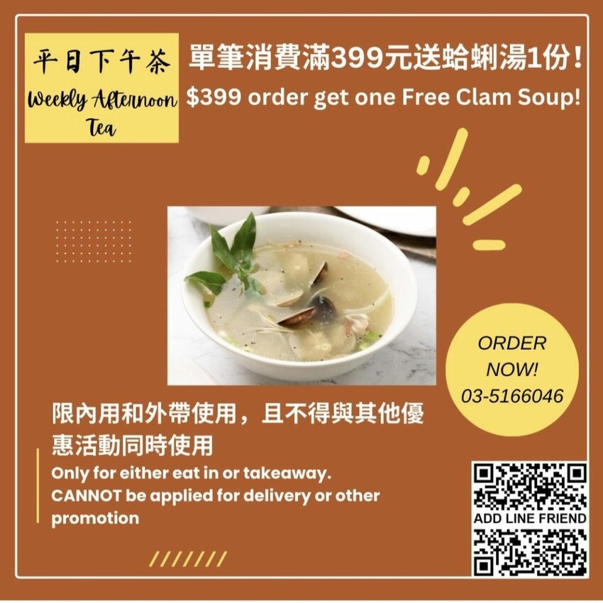 平日下午14:00~17:00時段消費滿399元,即可贈送蛤蜊湯乙份。