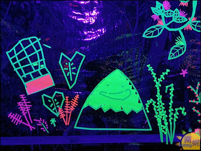 這一區螢光森林派對由超過150位埔里鎮民共同創作,在黑暗中閃耀繽紛的光芒非常有特色。