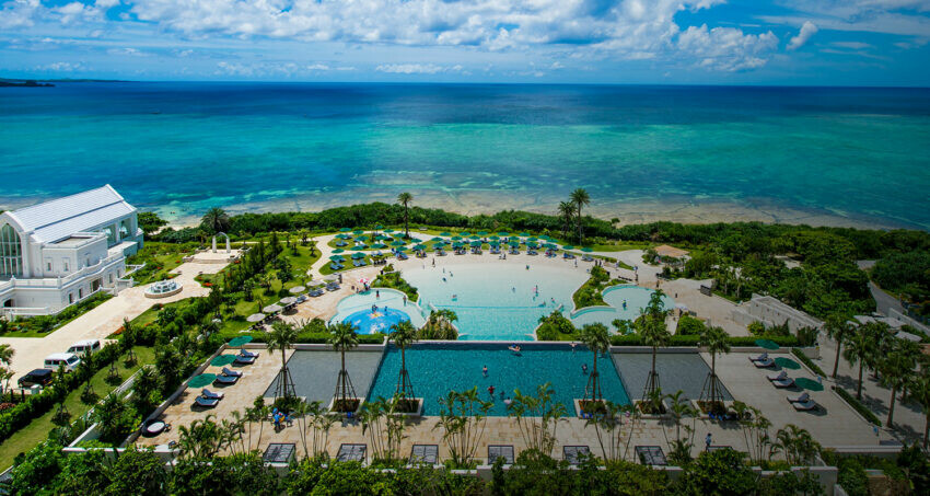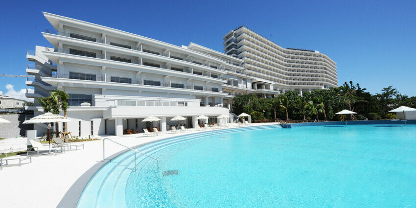 這家外表像是一艘大型郵輪停靠在恩那萬座海濱上的飯店就是「ANA全日空萬座海濱洲際酒店」,與其說他是飯店,它其實更像一個沖繩海景度假村。雖同為沖繩老字號海景飯店,但世界級的水準不僅榮獲2018世界旅遊獎,酒店內的設施「urumo Spa」更曾蟬連世界豪華水療設施獎的殊榮。飯店獨特的半島位置讓他雖然不是外島但卻四面皆環海,飯店內部有如大樓的挑高設計以及藍白色調的極簡客房配上室外的海景簡直完美,園區內還有游泳池、私人海灘、小海灣、SPA、高爾夫球場、還有水上氣墊運動場「萬座海洋公園」,幾乎無可挑惕的整體體驗也難怪被各界列為此生必住的沖繩海景飯店之一。