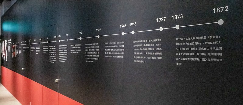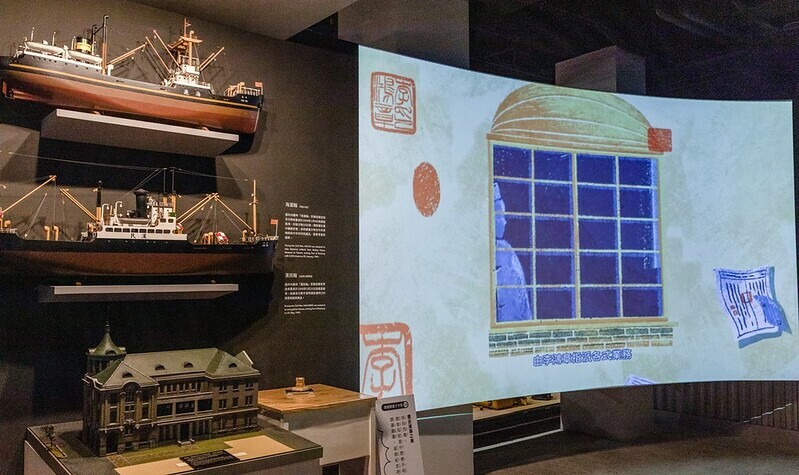 透過影片和模型可以清楚了解輪船招商局的演變,上面兩艘船模型分別是1949年裝著故宮文物來台的「海滬輪」(3502箱),及運送黃金290餘萬兩來台的「漢民輪」。