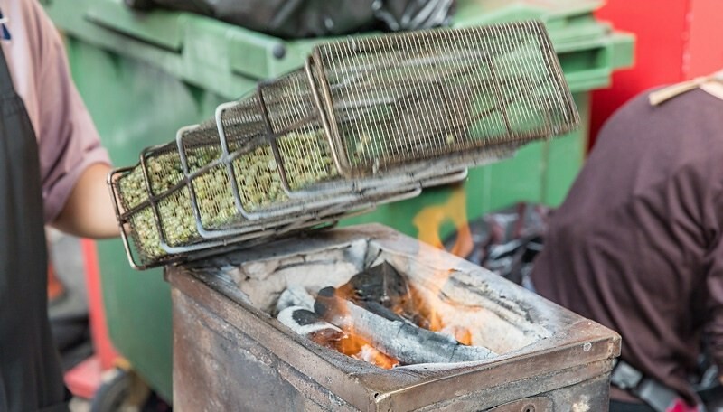 基隆十味之九「放屁豆」,這一味真的快絕味,就我所知只剩這一攤,幸好有一位年輕的妹妹接手。簡單說它就是炭火烤豌豆,烤好後灑上胡椒粉、辣椒粉當零食吃,據說是因為吃了會一直放屁所以叫放屁股豆,另一說是烤豌豆時豆子破掉的聲音像放屁。