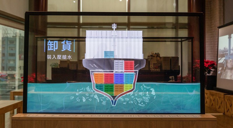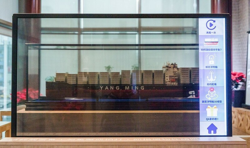 透過這個玻璃櫃的投影機,可以看到立體3D的貨櫃輪(陽明輪),以及貨櫃輪的簡單構造和它是如何行駛在海上的,另外還有Q&A問答獎品。