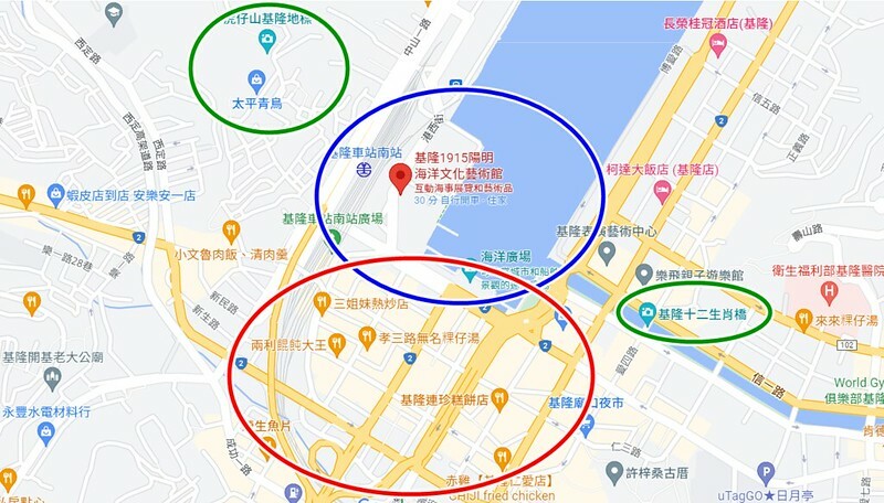 這篇主要介紹的是車站周邊,如果你能走,步行絕對沒問題,主題「基隆1915陽明海洋文化藝術館」,及2022/12/09起的「港城印事 | 基隆港運文化印章展」,綠色的是文末會分享的三大景點,十大基隆名物,紅色圈圈則是包含孝三路、仁愛市場、基隆廟口、崁仔頂等基隆美食主要區塊。35家車站周邊美食懶人包、44家身為老基隆人的味覺記憶,14家想入啡啡(基隆這幾年越來越受重視的咖啡、甜點)專題,還有11家仁愛市場美食特別報道,都會在文末再和大家好好聊聊。