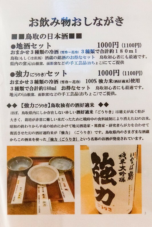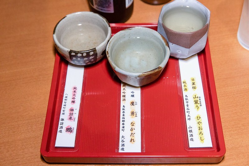 日本人多數喝酒的第一杯會是啤酒,即便是以地酒為主的居酒屋。第二回合我們點的是鳥取地酒set,1000日幣,另外也有鳥取特有的強力酒米set。剛巧中間那隻大谷酒造的鷹男銘柄是這次行程我們有去採訪的。另外兩隻分別是諏訪酒造,山根酒造都是鳥取非常有名的代表性酒造,特別一提的是這三杯也都是鳥取當地山根窯、面影窯的窯製品,三個杯子都不一樣,就這家店的fb粉絲團顯示,這間居酒屋常期和地方的手工藝品合作