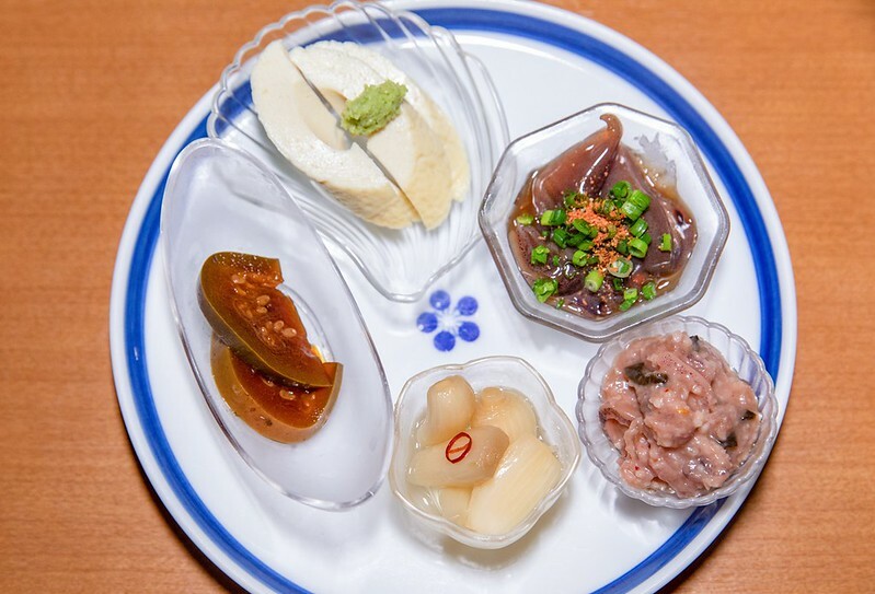 地酒set的最佳搭配自然是鄉土料理鳥取名物5品,價位頗為親民才650元和上面的menu對照一下,分別是正上方的豆腐竹輪,接著順時針方向分別是扇貝花枝、花枝內臟漬、鳥取的名物鳥取蕗蕎、還有西瓜漬物。當中大家比較知道的應該是很酸卻很口感爽脆,個人也非常愛的鳥取辣韭,另外右邊兩個都是以鳥取出名的白花枝作的,內臟味有一點重,但非常下酒,漬西瓜和豆腐竹輪也都相當特別。