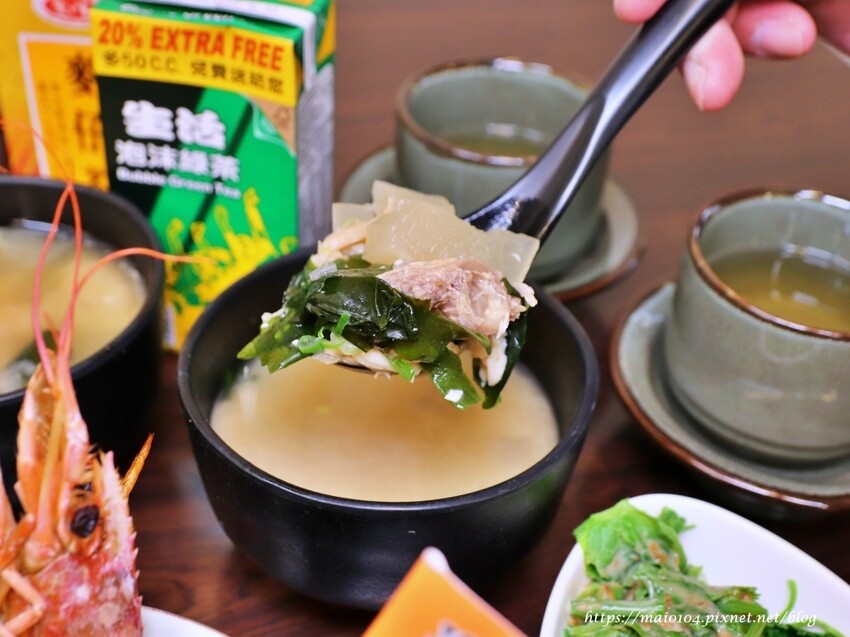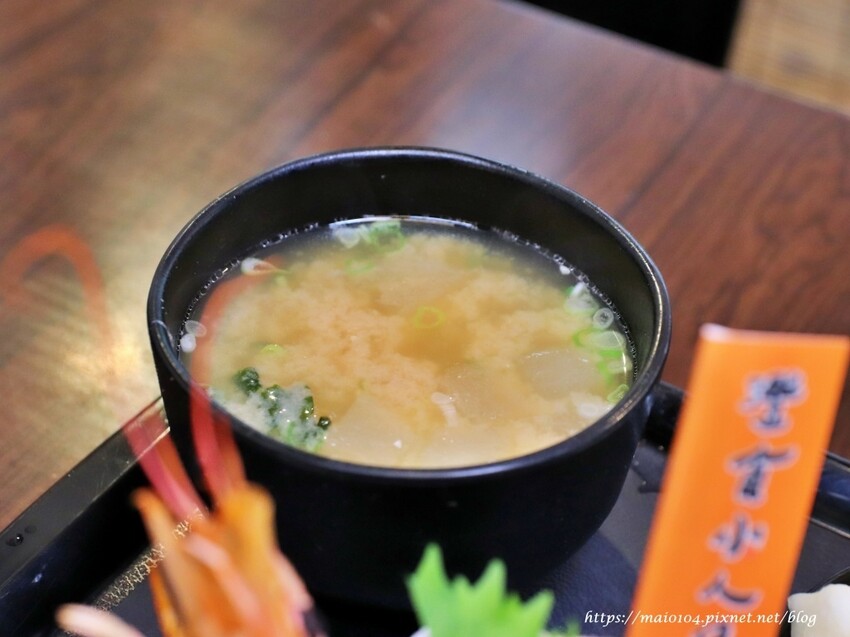 味噌湯料很多,裡面有豆腐、海帶芽、白蘿蔔、魚肉