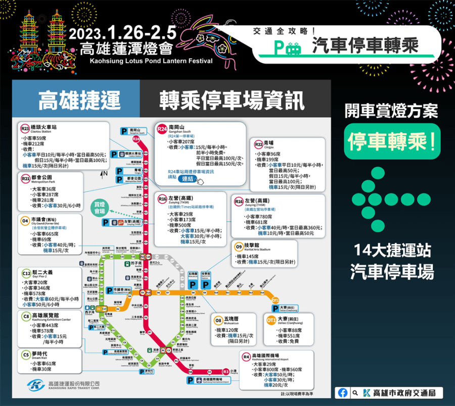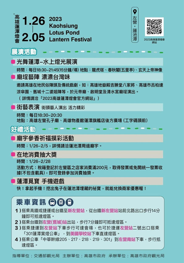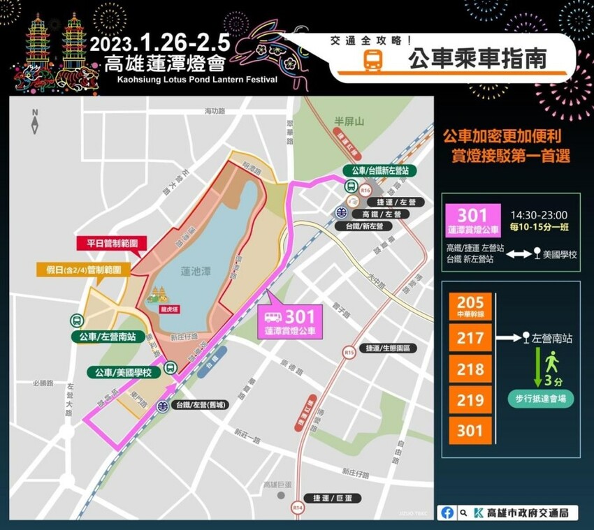 搭乘捷運民眾可在捷運左營站下車步行或轉乘「301蓮潭賞燈公車」,
