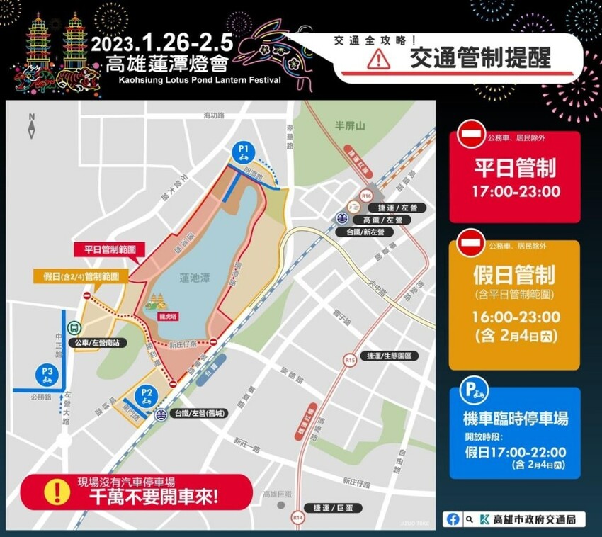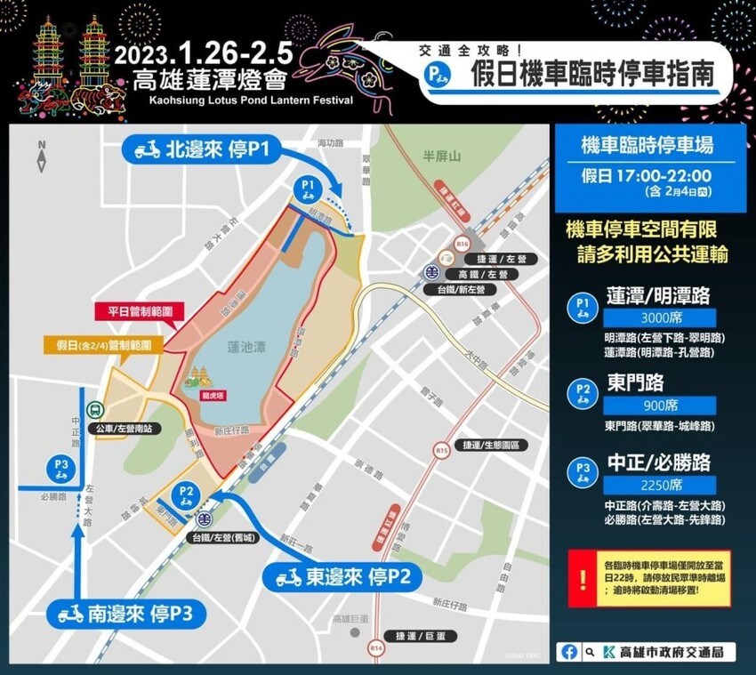 騎機車的朋友可以於 蓮潭與明潭路、東門路、左營中正路與必勝路,共設置3處臨時停車場停放