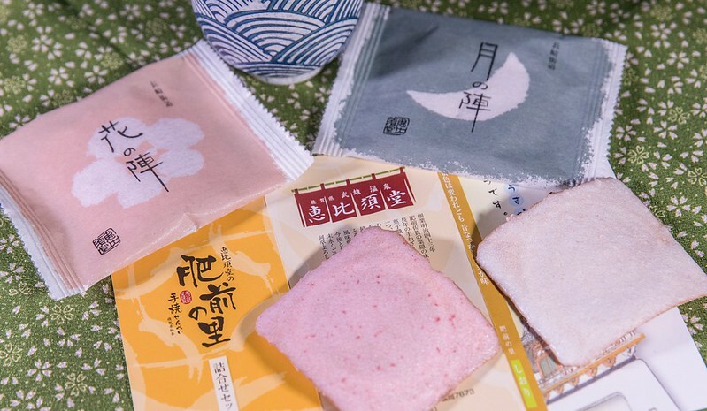 另裡面有兩種顏色口味的夢本陣,外型有一點像方型的瓦片,夢本陣的名字來自佐賀武雄溫泉一帶長崎街道的名字。口感端有一點像最中的皮,但再酥一點、脆硬一點,也有幾份像米香或是蝦餅,各種口味和前面的煎餅差不多,但嚐起來更淡了些,非常適合佐茶。