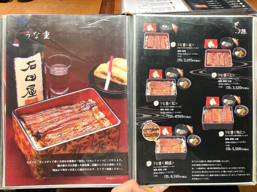 鰻魚飯、鰻魚飯三吃、蒲燒鰻、白燒饅、鰻魚一品料理皆有。