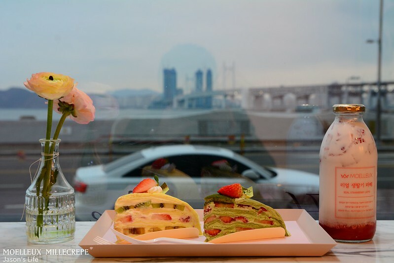 - 【釜山|美食】海雲台冬柏站甜點,IG熱門打卡,看著廣安大橋,吃著草莓千層,喝著草莓牛奶,欣賞夜景。MOELLEUX MILLECREPE