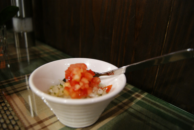 以切的細碎的蒜、香芹、紅椒末,佐以油醋(橄欖油、醋)提味,口感微酸沁爽,讓品嚐肉排時可以嚐到多元的口感與氣味。
