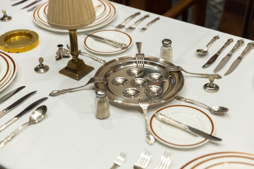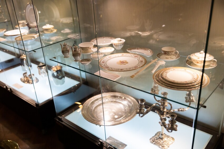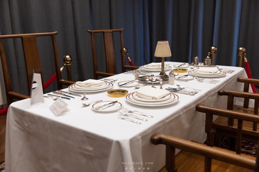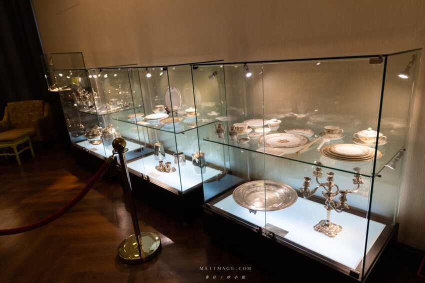 客廳旁也陳列了從前國宴所使用的餐盤,到目前都保留的相當完整。有銀器、有瓷器。