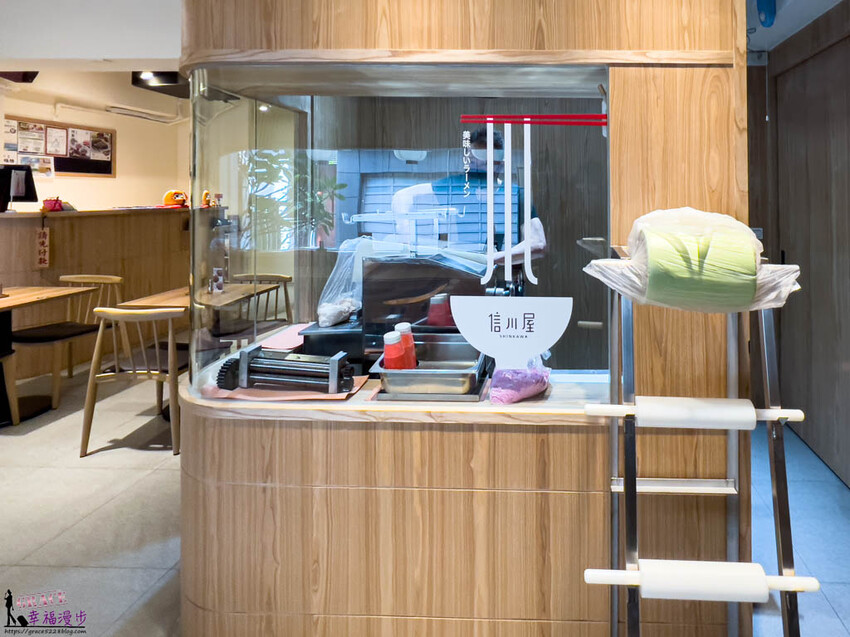 踏進店內首先看到的是老闆製麵的工作室,信川屋的麵條都是老闆自己手做,完全不添加色素、鹼粉、防腐劑,整個麵團需要反覆壓碾、靜置作工相當繁瑣,來的時候碰巧老闆正在做七彩麵條耶!