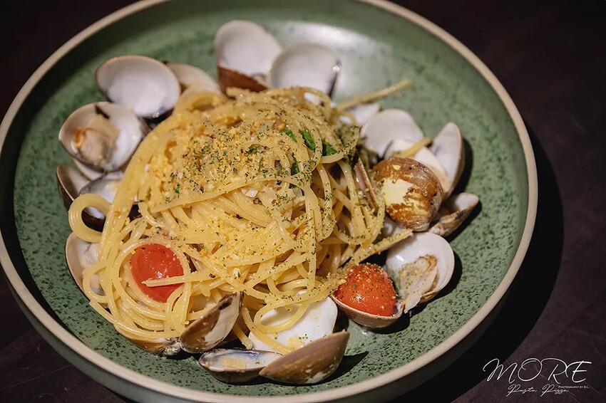 「默爾 Pasta Pizza」的義大利麵共有 4 款不同口味,提供奶油、番茄、青醬以及橄欖油系列調味的義大利麵。聽說品嚐義大利麵若想要看廚師的功力就要選擇單純使用「橄欖油」下去製作的義大利麵。這道「清炒白酒蛤蠣義大利麵」透過橄欖油與簡單配料並用清炒方式做搭配。雖然義大利麵煮熟後,麵條中的「麵心」雖然基本上會比較硬一些,不過入口後的味道還帶有蛤蠣的海鮮甜味,可以說真的好吃。