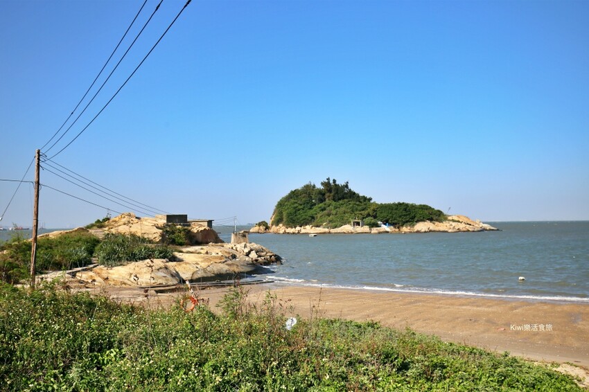 馬山觀測所哨口前的右邊可以走到馬山海岸欣賞風景,沿岸也可以看見軌條砦,用廢棄火車鐵軌製成的軌條砦,將鐵軌裁切成一截一截的鐵柱,並且將末端削成尖狀,大概50度角斜插入水泥灌漿裡,一致對外,是種反登陸樁,在大金門、小金門都能看得見!對面軍事小島是后嶼,上頭也有個崗哨。