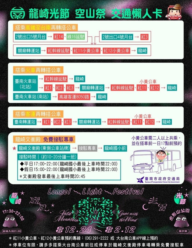*汽車請停放於龍崎文衡殿轉接駁車至展場。(憑票券免費搭乘,免票入場身份請出示證件免費搭乘)