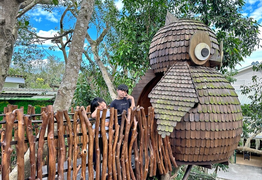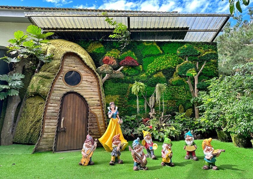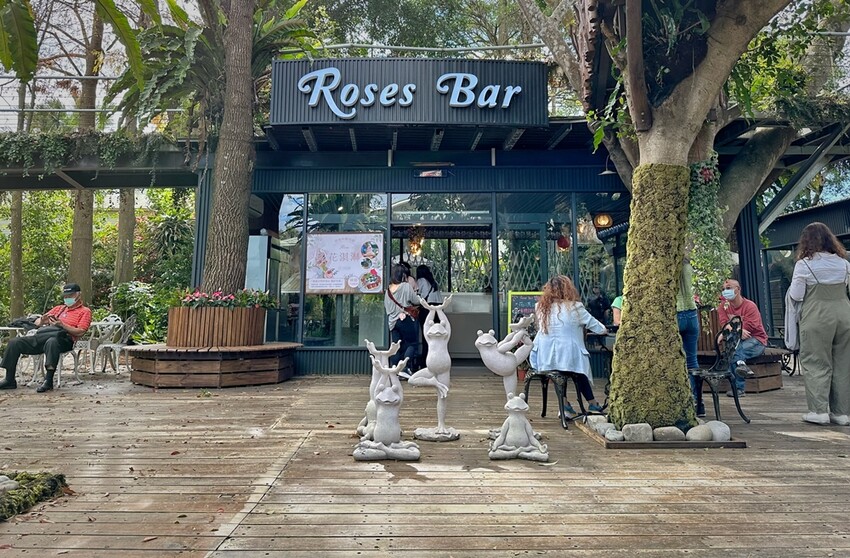 最後離園前,當然就是要來Roses Bar(花園咖啡館)吃霜淇淋,據說Roses Bar(花園咖啡館)是花露休閒農場最新的咖啡館喔!這一區的布景也是十分的童趣,可以想像自己是白雪公主跟著可愛的七矮人一起拍照。Roses Bar主要提供的是咖啡、甜點、霜淇淋和酒品等,在這消費同樣可以拿出門票來做折抵,這天我們就點了濃情玫瑰霜淇淋跟蘭姆可可霜淇淋來品嘗,霜淇淋味道真的十分濃郁好吃喔!吃完冰品也千萬不要錯過Roses Bar玻璃屋的閣樓有座巨無霸貓頭鷹,叢林中的貓頭鷹真的很好拍照!
