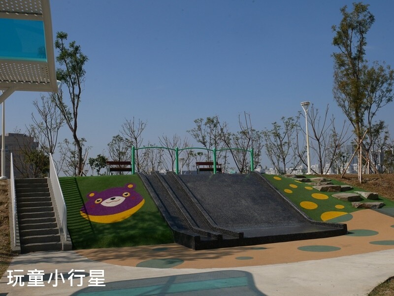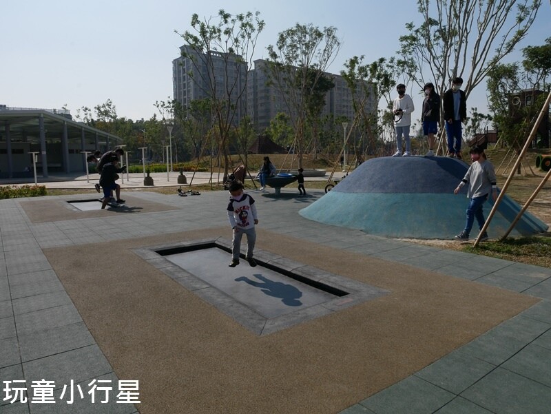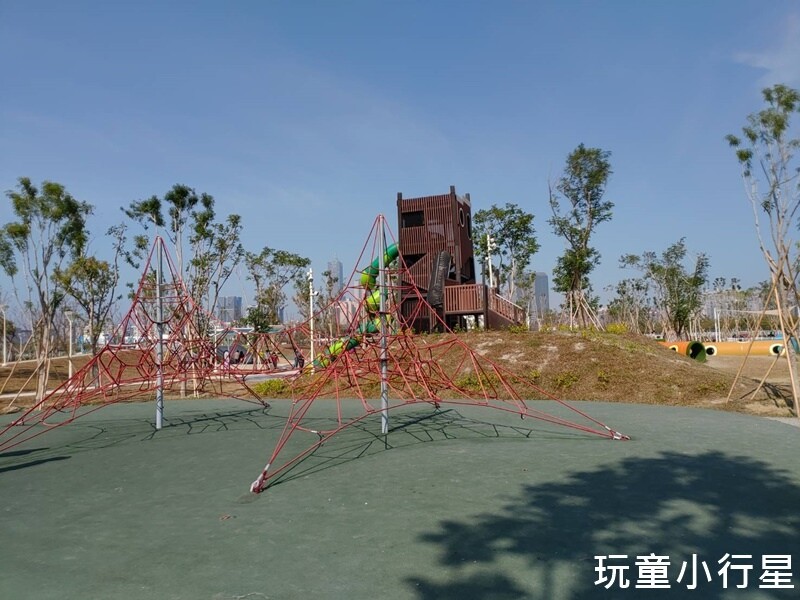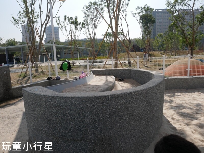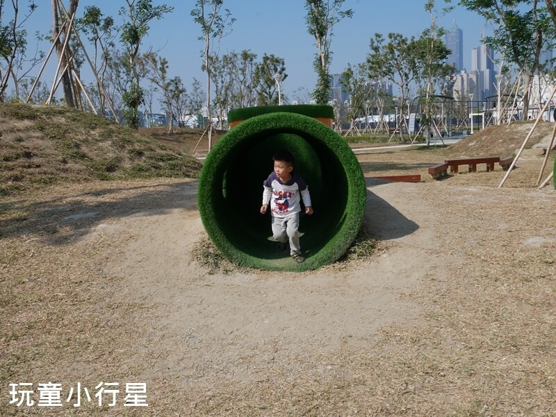 沙坑後方有遊戲丘、空心水管,小朋友可以爬上爬下、在洞裡鑽來鑽去,享受探險的樂趣。