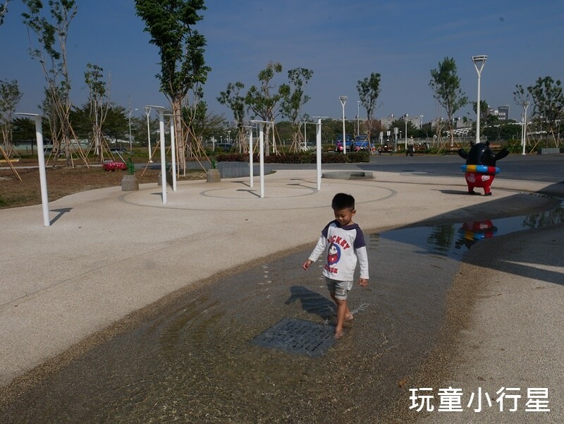 兒子將褲管捲起,在漂漂河玩水,過沒多久花灑噴水了!