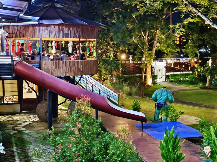 背對滑梯的還有個綠巨人浩克的雕像,這家紅橋餐廳還真是處處驚喜