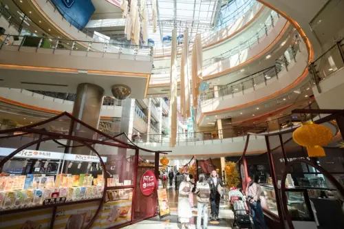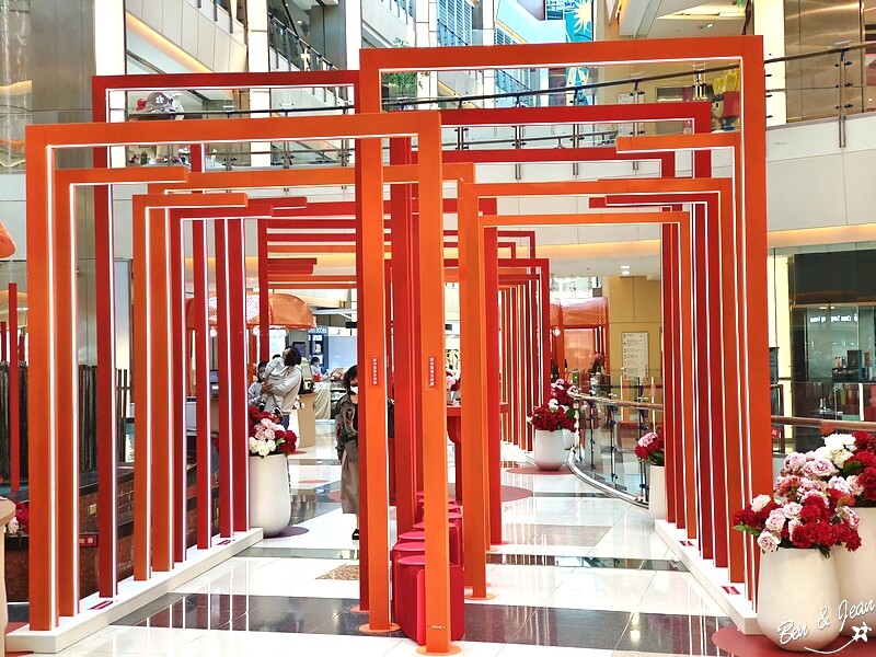 從購物中心上方延伸下來的彩帶顏色好喜氣。
