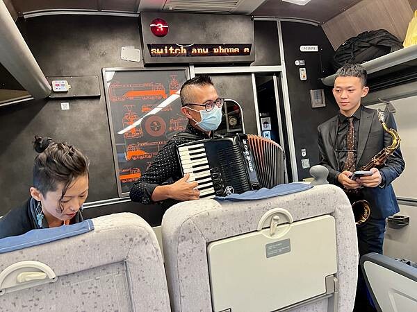 在回程的鳴日號上,可以深切感受到雄獅旅行社,真的花了很多時間與人員,來經營鳴日號旅遊,持續在開發新的景點,發掘有特色的餐廳。各車廂有專屬服務人員,也有專任導遊陪伴,餐車上也有許多服務人員,替旅客做飲料、零食、咖啡、熱茶、啤酒等服務。晚餐的便當餐盒也特別設計,用完餐還可將環保餐盒帶回家。還特別邀請了樂團「Live香頌蕯克斯風+手風琴演奏」,在每一個車廂裡表演,表演者也很努力,我們都看在眼裡。我們的導遊真的非常優,我在第一天才接觸ㄧ小時,就發現他是個優質導遊,無論在聯絡、行程說明、景點歷史文化解說、處理突發事情、服務的貼心、對每位遊客的關注,都非常到位。我以後不ㄧ定會再參加鳴日號旅遊,但願意推薦給沒去過的朋友們,值得参加一次,對我們居住的寶島台灣,會有不同的體驗與感受。