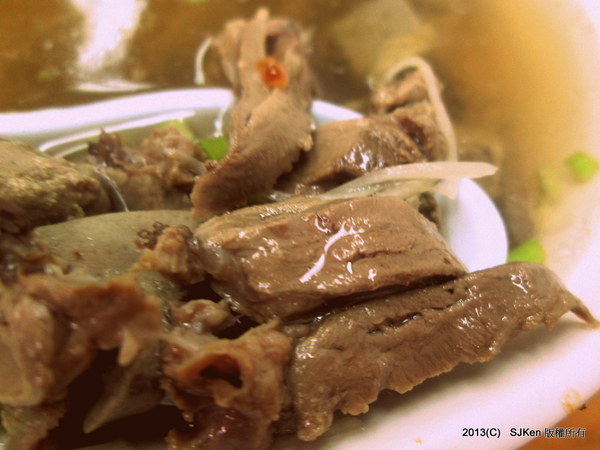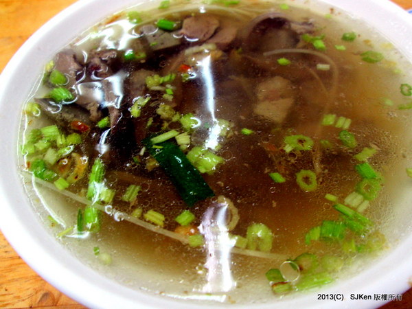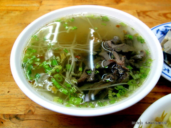 接著是要大力推薦「下水湯」(NT$40),這家的「下水湯」與眾不同,不是一般常吃到的以雞為主的,而是有鵝肝、鵝胗、鵝腸為主的「鵝肉下水湯」,加上了有芹菜、韮菜與薑絲調味的湯底,看起來不算大碗的「下水湯」,裡面卻是食材滿滿份量紮實的,吃起來好過癮,湯頭鮮美,喝起來很有飽足感。