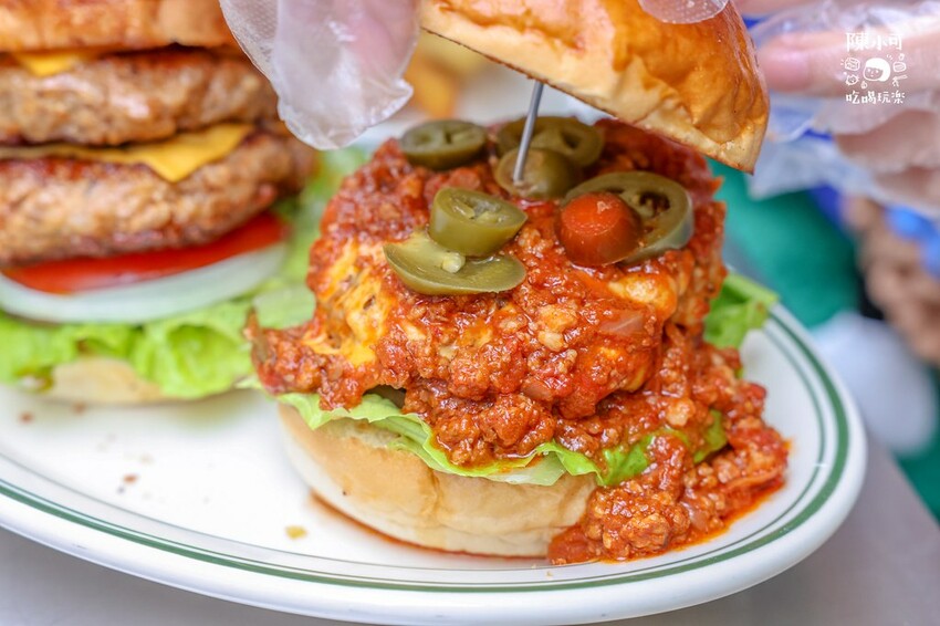 墨西哥燉肉醬豬肉堡的外觀相當吸睛,豪邁的燉肉醬像土石流般的傾斜流下,加上墨西哥辣椒就是重口味推薦。