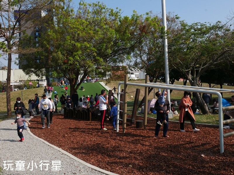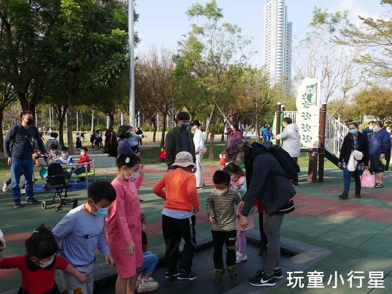 時逢過年連假,來公園玩的小孩較多,年紀較小的小朋友彈跳時,大人最好牽著手預防被彈出來撞到受傷。